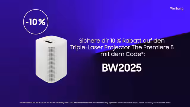 01:49:35Nach der Community-Interaktion wurde ein Glücksrad gedreht, das die Kategorie 'TV' hervorbrachte. Hier wurden verschiedene Samsung-Produkte und die aktuellen Black Week Deals vorgestellt. Besonders hervorgehoben wurden der Triple Laser Projektor Premiere 5, für den es 10% Rabatt mit dem Code 'BW 2025' gab, und der Frame TV, der mit 5% Rabatt angeboten wurde. Der Frame TV wurde für seine Fähigkeit gelobt, im ausgeschalteten Zustand Kunstwerke darzustellen und sich nahtlos in die Wohnumgebung einzufügen. Zudem wurden die Neo QLED- und OLED-4K-Serien, Gaming-OLEDs wie der S95F sowie verschiedene Soundbars erwähnt, die ebenfalls von den Rabatten profitieren. Die SmartThings-App wurde als zentrale Steuerung für alle vernetzten Geräte im Smart Home, einschließlich der Möglichkeit, das Handy als Fernbedienung zu nutzen, vorgestellt.