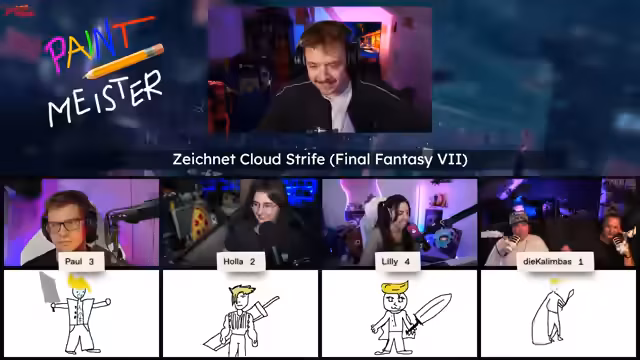 00:52:34Die zweite Runde startet mit dem Zeichnen von Cloud Strife aus Final Fantasy 7. Es wird betont, dass man sich Mühe geben soll und bei Unkenntnis des Charakters den Namen channeln soll. Als Tipp wird erwähnt, dass er blond ist. Es gibt erneut technische Probleme mit den Kameras und Bildern, die jedoch behoben werden. Es wird im Chat nach dem Lieblings-Videospiel-Charakter gefragt. Nach dem Einloggen der Bilder wird das Originalbild von Cloud Strife gezeigt und die Umfrage gestartet. Die Punkte werden verteilt: Holla erhält vier Punkte, Paul drei, Lilly zwei und die Kalimbas einen Punkt.