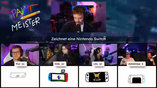 01:30:23Die Nintendo Switches werden präsentiert und es wird über Insider-Details in den Zeichnungen gesprochen. Eine Umfrage startet, um die beste Switch zu wählen. Es wird über die Unterschiede zwischen Switch 1 und Switch 2 diskutiert. Holla gewinnt die Abstimmung, gefolgt von Lilly und den Kalimbers. Die nächste Zeichenaufgabe ist Pummeluff. Es wird darüber gescherzt, dass ein Teilnehmer das Motiv verstecken muss, um nicht abgezeichnet zu werden. Die Teilnehmenden zeigen ihre nerdigen Gegenstände, darunter ein riesiges Mauzi und eine alte Rolleiflex-Kamera mit Chopper-Hut. Die Diskussion schweift zu Horror-Pummeluffs und der Frage, woraus ein Pummeluff besteht, ab. Es wird über Shiny Pummeluffs und deren Typen gesprochen. Es wird über das Pokémon-Line-Up gesprochen. Die Teilnehmenden werden aufgefordert, ihre Zeichnungen von Pummeluff fertigzustellen.