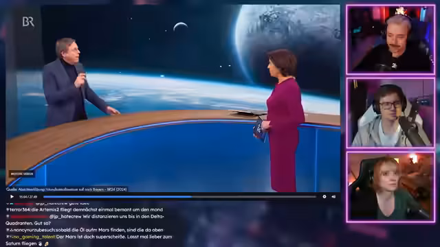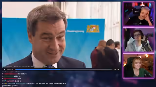 02:16:01Der Stream beginnt mit der Premiere des Videos 'Bayerns peinliche Mondmission' für die Teilnehmerin Anna. Das Video kritisiert den bayerischen Ministerpräsidenten Markus Söder und dessen ambitioniertes, aber als unrealistisch und elitär empfundenes Raumfahrtprogramm 'Bavaria One'. Der Film wird als eine Satire auf Söders Größenwahnsinn und den angeblichen Eigenständigkeitsanspruch Bayerns verstanden.