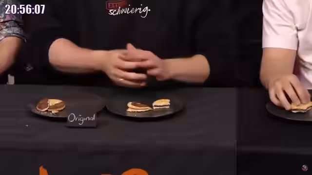 02:47:39Der LiveStream wechselt zu einem Blindtest, bei dem fünf Produkte in ihrer Original- und Billig-Variante verglichen werden. Die erste Runde widmet sich der Prinzenrolle. Die Teilnehmer versuchen, anhand von Geruch, Aussehen und Geschmack das Original zu identifizieren. Es wird festgestellt, dass beide Kekse ein Logo eingestanzt haben. Beim Riechen bemerken einige einen Unterschied, wobei ein Keks nach 'Hasenfutter' riecht. Beim Probieren fällt auf, dass ein Keks knuspriger ist und weniger Schokolade enthält, während der andere eine dickere, aber zuckerlastigere Schokocreme hat. Trotz der Annahme, dass mehr Schokolade das Original ausmacht, stellt sich heraus, dass der vermeintlich 'billigere' Keks mit mehr Schokolade tatsächlich das Original ist, was zu Überraschung und Enttäuschung führt.
