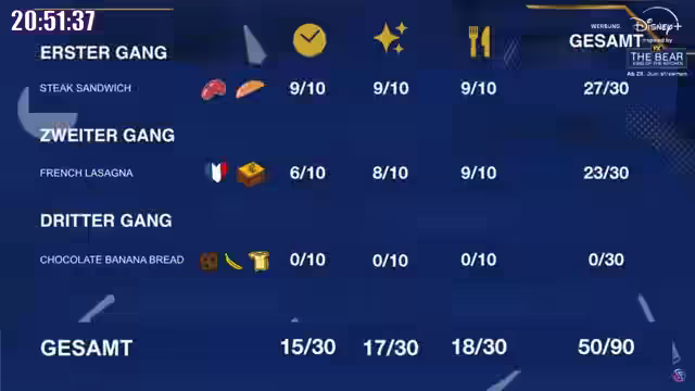 00:29:37Im Finale des Kitchen Battles erreicht das Münchener Team 10 Punkte in der Kategorie Zeit und 10 Punkte in der Optik. Ein Zuschauer gewinnt ein Jahresabo für Disney Plus. Die Verkostung des letzten Gerichts führt zu begeisterten Reaktionen und hohen Bewertungen, mit mehreren 10 von 10 Punkten von den Testern. Insgesamt erreicht das Münchener Team 80 von 90 möglichen Punkten, was als sehr starkes Ergebnis gefeiert wird. Nach dem Kitchen Battle beginnt ein XXL-Test von Tiefkühl-Lasagnen. Jan, ein professioneller Lasagne-Vernichter, und Nils als Kontrollgruppe bewerten verschiedene Sorten. Die erste getestete Lasagne, eine K-Classic Favorites Lasagne Bolognese, wird als cremig, aber wenig gewürzt beschrieben und im B-Tier eingeordnet. Eine weitere Lasagne von Aldi wird als würziger, aber mit zu weichen Platten und zu viel weißem Zeug kritisiert. Eine vegane Lasagne Verdure von Genusswelt wird trotz fehlender Hauptzutaten positiv bewertet und erhält ein A-Tier-Rating für ihre innovative Zubereitung.