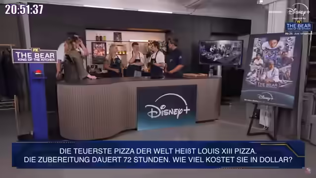 00:20:46Nach den ersten Runden des Kitchen Battles wird eine Spezial-Challenge angekündigt: Eine Leberkässemmel soll auf Streetfood-Art so angerichtet werden, dass sie mindestens einen Stern wert ist. Dies geschieht auf Wunsch eines nicht-Münchner Gastes, der vor seiner Heimreise eine Leberkässemmel essen möchte. Das Gericht wird mit eingelegtem Gemüse, Basilikum-Creme, Tommeri-Senf und Gurkenblüten präsentiert. Anschließend folgen weitere Quizfragen, darunter die Frage nach dem Erfinder des Speiseeises, bei der das Münchener Team China korrekt errät. Eine weitere Frage betrifft den Preis der teuersten Pizza der Welt, bei der das Team mit 11.111 Dollar nah an den tatsächlichen 12.000 Dollar liegt. Es werden auch Handicaps für das Berliner Team vergeben, basierend auf falsch beantworteten Fragen, wie zum Beispiel die Angst vor dem Kochen (Magirokophobie).