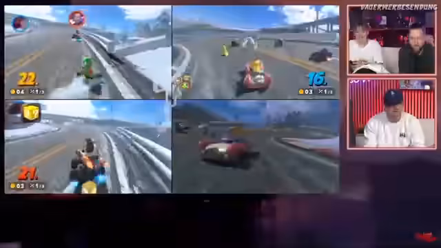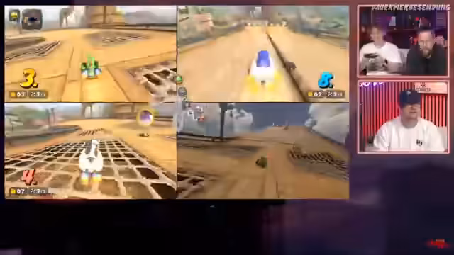 04:25:25Die Rennen gestalten sich als äußerst chaotisch und anspruchsvoll. Ein Spieler kämpft damit, auf der Strecke zu bleiben und wird ständig von Items wie Raketen und Bomben getroffen. Das Fahren auf den neuen Strecken, wie der mit Piratenschiffen, erweist sich als schwierig, da man viel aus der Strecke fliegt. Diskussionen über die unfairness von Items und die eigenen Platzierungen sind ständige Gesprächsthemen während der Rennen.