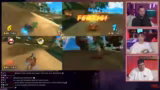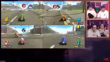 00:59:09Nachdem die Spieler das Spielverhalten besser verstehen, werden die Runden auf 150cc erhöht, was die Herausforderung verschärft. Die Teilnehmer entdecken und nutzen fortgeschrittene Techniken wie 'Grinden' (das wiederholte Hüpfen auf Schienen für Geschwindigkeitsboosts) und 'Tricks', die durch Sprünge ausgelöst werden. Der Wettbewerb wird aggressiver, mit wiederholtem Abschießen, Drängen von der Strecke und strategischem Einsatz von Items. Der Streamer merkt an, dass die Bildqualität durch das Simulieren von vier Splitscreens leidet, was zu einer ruckelnden Übertragung auf Twitch führt und für den Zuschauer unangenehm ist.