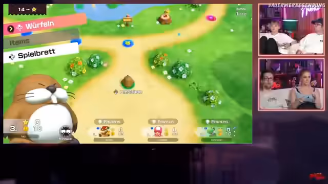 01:12:28Nach mehreren intensiven Mario Kart-Runden wechseln die Streamer zum Spiel Mario Party Jamboree. Das Setup erfordert die Neuverknüpfung der Controller, was zu anfänglichen Verwirrung führt. Die Spieler wählen das Spielfeld 'Mega Wigglers Leckerwald' und eine normale Runde wird gestartet. Während des Spiels diskutieren sie über technische Aspekte wie die Button-Belegung und die grafische Überarbeitung. Gleichzeitig wird die schlechte Bitrate des Streams erneut thematisiert, die durch die hohen Anforderungen an die Übertragung des vierteiligen Splitscreens entsteht.