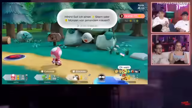 01:16:30Die Runde in Mario Party Jamboree geht weiter, wobei die Spieler über Anekdoten und persönliche Erlebnisse sprechen, wie einen Traum nach einem Mittagsschlaf oder einen Unfall mit einem Heißboden. Währenddessen konfrontiert der Streamer Domo damit, dass dieser beim Navigieren auf dem Spielbrett gelogen hat. Das Gameplay selbst konzentriert sich auf das Sammeln von Münzen und das Besieigen von Gegnern wie Bowser. Der Ton der Teilnehmer und die Reaktion des Chats werden ebenfalls zur Sprache gestellt, als der Streamer die Qualität des Streams hinterfragt.