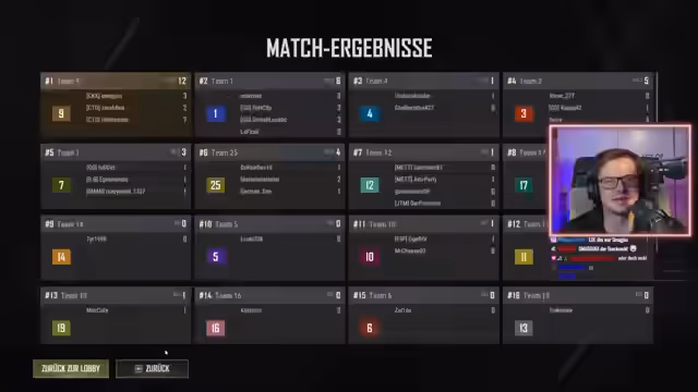 02:01:36Nach mehreren intensiven Runden nähert sich das Ende des Streams. Die Spieler reflektieren über ihre Leistung und vergleichen Kills und Platzierungen. Es gibt Ankündigungen für zukünftige Events und Streams, insbesondere die Pub-Games am Sonntag werden beworben. Der Stream endet mit einem freundlichen Abschied und der Wiederholung der Uhrzeiten für zukünftige Inhalte.