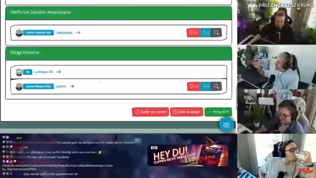 01:28:07Es beginnt eine Diskussion über den 'invertierten Igel' als sexuelle Praktik, der als eine Art Pimmelparty mit vielen Schwänzen an einer Person beschrieben wird. Der 'innenliegende Drehspieß' wird als bildlicher und innovativer beschrieben. Danach wird über eine geeignete Waffe für eine Zombie-Apokalypse gesprochen, wobei ein 'Igelschläger' vorgeschlagen wird, bei dem ein Igel an einen Stock gebunden wird. Die Idee, Idris Elba als Waffe zu benutzen, wird diskutiert, aber verworfen, um keine Objektifizierung zu betreiben. Anschließend wird über eklige Eissorten fantasiert, darunter 'Iglo-Eis' und 'Fischstäbchen-Eis'. Das Team einigt sich darauf, dass Ingwer-Wassereis eine akzeptable Option wäre. Abschließend wird festgestellt, dass die Runde beendet ist und ein neues Spiel namens Neighbor-Verwüsten-Spiel gezockt werden soll. Paul gewinnt die Runde mit 360 Punkten, wobei ein Kreativbonus fehlt. Es folgt die Ankündigung, dass Essen bestellt wird, wobei die Präferenz auf chinesische Nudeln fällt. Es wird kurz in die Gaming-News geschaut, die jedoch als Clickbait und Affiliate-Kacke abgetan werden. Stattdessen werden wissenschaftliche Nachrichten auf iflscience.com angesehen, darunter die Entdeckung von Sauerstoff in der frühesten bekannten Galaxie und ein Mann mit einem Titanherz.