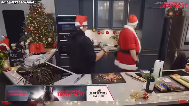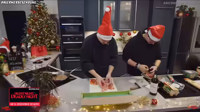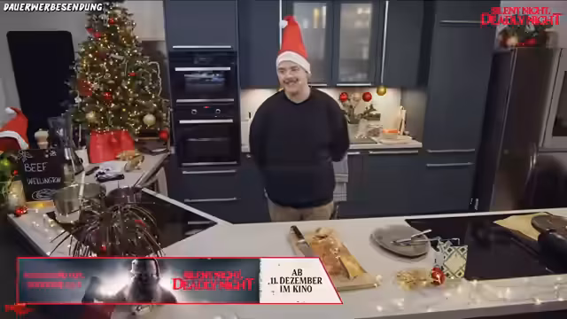 01:08:38Parallel zu den Kochschritten wird der Film 'Silent Night, Deadly Night' thematisiert. Der Streamer, ein großer Fan von Weihnachtsslasher-Filmen, äußert seine Vorliebe für das Original aus dem Jahr 1984, dessen er sich erst später angeschlossen hat. Er kündigt an, den Trailer des Remakes anzuschauen und gibt bekannt, dass ein Gewinnspiel mit Kinotickets und Fanpaketen für den Film startet, um die Vorfreude auf die Kinostart am 11.12. zu schüren.