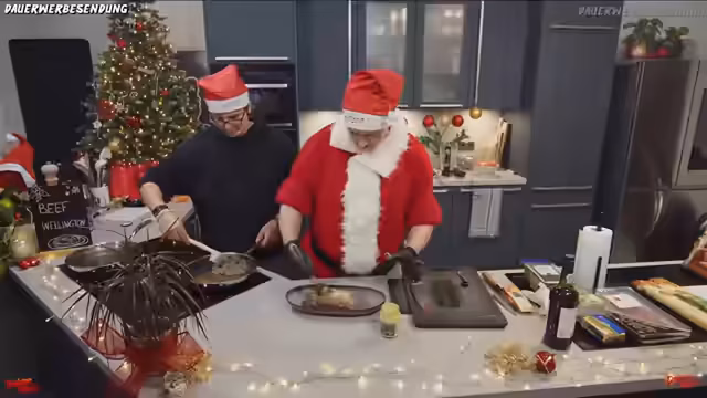 00:21:53Der Weihnachtsmann gibt das Mikrofon zurück und die Vorbereitung für das Kochen beginnt. Zuerst wird das Rinderfilet vorbereitet. Es wird pariert, indem die Silberhaut und überflüssiges Fett entfernt wird. Anschließend wird das Fleisch großzügig gesalzen. Das Salz zieht durch Osmose den Fleischsaft nach außen, was das Fleisch von innen würzt. Währenddessen werden frische Pilze für die Duxelles, eine Pilzpaste, vorbereitet. Ein Mixercleaner-Lifehack wird gezeigt, um Utensilien hygienisch zu reinigen.