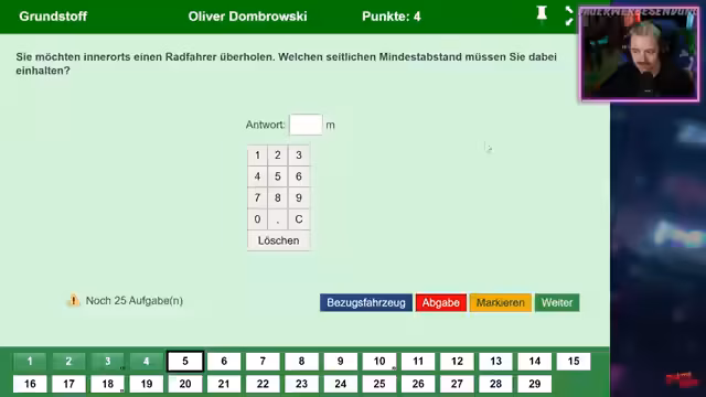 03:17:45Der Stream beginnt mit der Funktion des Spurhalteassistenten, der hauptsächlich beim Geradeausfahren durch Lenkeingriffe in der Spur hilft. Beim Abbiegen, das als Verlassen der Spur definiert ist, unterstützt das System nicht. Anschließend wird besprochen, dass Radfahrer oft ohne Beleuchtung bei Dunkelheit fahren oder Radwege in der falschen Richtung nutzen. Des Weiteren werden typische Anzeichen von Müdigkeit im Straßenverkehr erörtert, wie schwere Augenlider, verkürzte Reaktionszeit ist dabei jedoch ein irreführender Begriff.