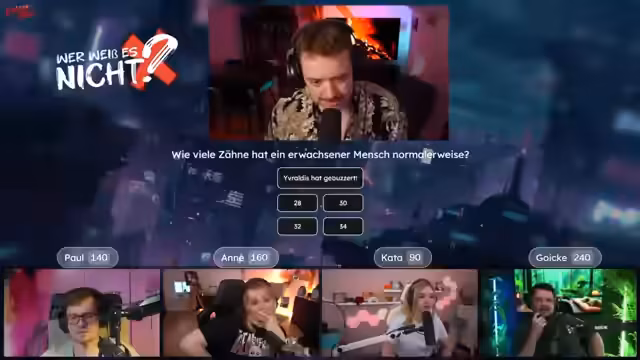 00:44:06Das Quiz beginnt mit der ersten Frage nach der Dauer des kürzesten Krieges in der Geschichte. Paul buzzert setzt 20 Punkte darauf, dass Goike die Antwort nicht weiß. Goike antwortet korrekt mit 45 Minuten, wodurch Paul seine Punkte verliert. In der Folgefrage über eine Erfindung, die ursprünglich als Tapetenentferner diente, buzzert Goike und setzt 20 Punkte auf Pauls Unwissen. Paul antwortet falsch mit 'Nagellackentferner', die richtige Antwort ist 'Knete'. Goike verdoppelt seine Punkte und führt das Quiz an.