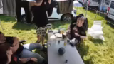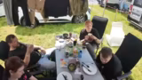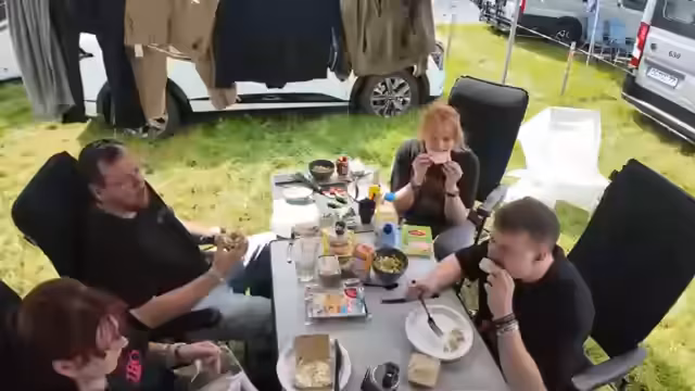 00:02:02Die Macher des Streams frühstücken gemeinsam mit ihren Mitcampern und wenden sich ihrer community zu. Sie sind auf dem Wacken Open Air Festival und berichten von den widrigen Bedingungen des Vortages, insbesondere dem extrem schlammigen Rückweg zum Campingplatz, der zweieinhalb Stunden gedauert hat. Während des Frühstücks wird von kleineren Problemen berichtet, wie einem defekten Chat oder dem Verlust eines Schuhes. Es werden diverse Grüße an die Community ausgetauscht und der Zusammenhalt im Camp betont.