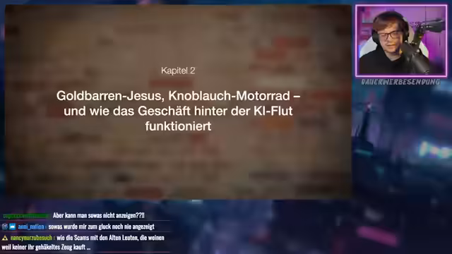 01:33:45Nach den Hundevideos wechselt der Streamer zu einem Video von Topvollgold mit dem Titel 'Die KI-Hölle auf Facebook: Wie KI-Kanäle YouTube übernehmen'. Er zeigt sich beeindruckt vom Einstiegsbild, der 'Jesus-Karotte', und fragt die Zuschauer, wer noch aktiv Facebook nutzt und ob sie dort bereits den vermehrten KI-Wahnsinn bemerkt haben. Viele bestätigen, dass sie einen hohen Anteil an KI-generiertem Content sehen. Das Video erklärt, wie gefährlicher KI-Content das Internet überflutet, insbesondere auf Facebook, das weltweit das meistgenutzte soziale Netzwerk ist. Es wird aufgezeigt, dass Facebook-Seiten massenhaft KI-generierte Bilder von Kindern und Babys posten, die hohe Interaktionsraten erzielen, oft mit religiösen oder anzüglichen Kommentaren. Viele Nutzer erkennen nicht, dass die Bilder KI-generiert sind, selbst bei offensichtlichen Fehlern wie drei Händen. Besonders kritisch sind Seiten, die mit emotionalen Geschichten oder Bildern von kranken/verstümmelten Kindern um Aufmerksamkeit und Likes betteln. Der Streamer kritisiert die Rolle von Meta, dem Mutterkonzern von Facebook, der KI-Content fördert und keine Kennzeichnungspflicht verlangt. Er betont die Wichtigkeit, dass sich Nutzer mit KI auseinandersetzen und diese mit 'guten Gedanken' füttern, um die Lernprozesse der KI positiv zu beeinflussen und eine einseitige Entwicklung zu vermeiden. Er ermutigt die Zuschauer, KI-Tools wie ChatGPT oder Gemini zu nutzen, um ihre Perspektiven einzubringen. Das Video geht auch darauf ein, wie Content-Ersteller durch Interaktionen auf Facebook Geld verdienen, was die Flut emotionaler und absurder KI-Inhalte erklärt. Zum Abschluss wird die Website 'keinslop.de' vorgestellt, die Links zu Creatoren sammelt, die hochwertigen, nicht-KI-generierten Content produzieren, und der Streamer ermutigt die Zuschauer, dort auch seinen Kanal einzureichen.