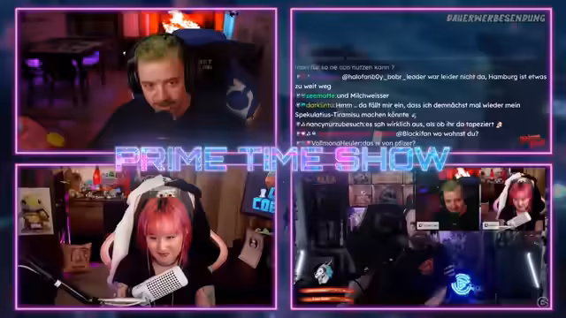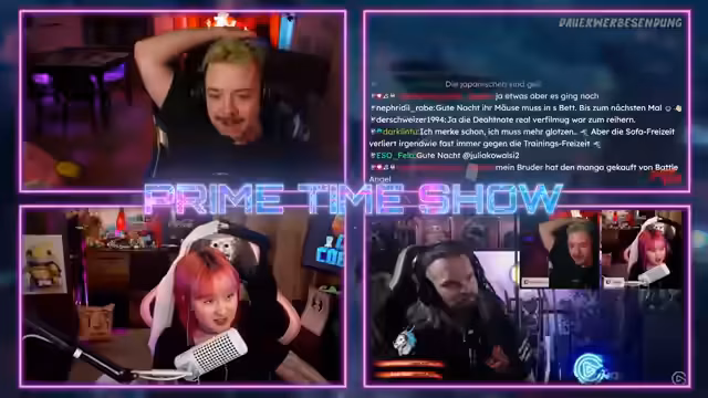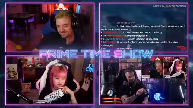 00:17:01Die Primetime-Show beginnt mit technischen Problemen, die schnell gelöst werden. Der Streamer begrüßt die Community und bittet um Musikwunsch. Als erstes Highlight wird der Eurovision Song Contest ausgestrahlt, der mit 10 von 10 bewertet wird. Ein Teilnehmer mit klassischer Gesangsausbildung aus dem deutschen Vorentscheid im Jahr 2000 wird als bester Auftritt aller Zeiten gefeiert und ein reiner ESC-Fan äußert sein Bedauern über die Qualität, die sich von 2000 bis 2007 stark verbessert hat.