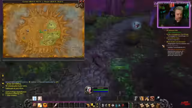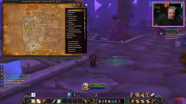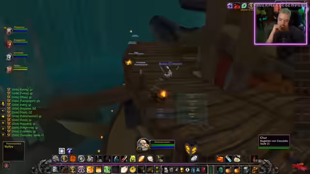 04:32:15Der Streamer befindet sich im Hafen von Menethil und koordiniert sich mit anderen Spielern über den weiteren Weg. Er fliegt mit dem Schiff nach Auberdine in der Dunkelküste und stellt fest, dass er weitere Quests in der Umgebung erledigen möchte. Während der Wartezeiten auf das Schiff oder bei der Erkundung der Umgebung werden Gegenstände gesammelt und Inventar geräumt. Die Kommunikation mit den anderen Spielern erfolgt über das Spielchat, um Treffpunkte und Aktionen abzustimmen.