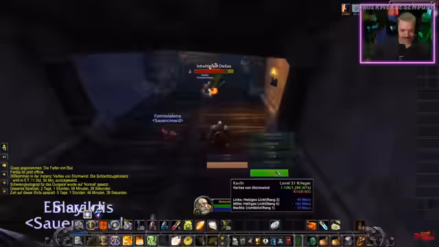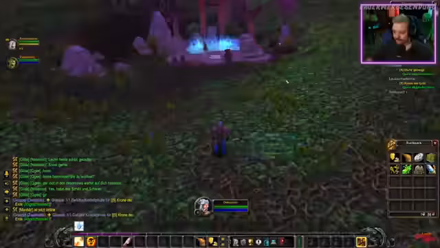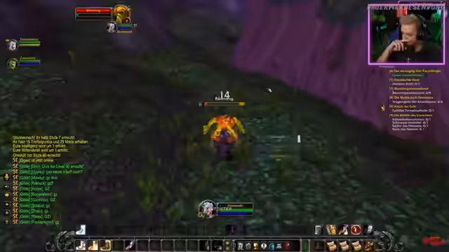 08:00:29Die Streamerin befindet sich in Stormwind, dem Hauptstadt der Allianz, und hat den Flugpunkt aktiviert, was ihr ein Gefühl von Heimatlichkeit vermittelt. Sie interagiert aktiv mit dem Chat, unter anderem mit einer Person namens Lena, von der sie sich eine Tasche wünscht. Es gibt eine Anekdote über einen Rekord von 14 Saltos und ein Sub-Versprechen für 20 Saltos. Im Mittelpunkt steht die Gruppe mit 'Lost Kitten' und 'Ranger', die aus einem Dungeon zurückkehren, wo ein versehentliches Pullen des Bosses zum Totalausfall führte. Die Streamerin bittet um eine Einladung in die Gruppe der Spieler, um wieder auf denselben Server zu gelangen und gemeinsam weiterzuspielen.
