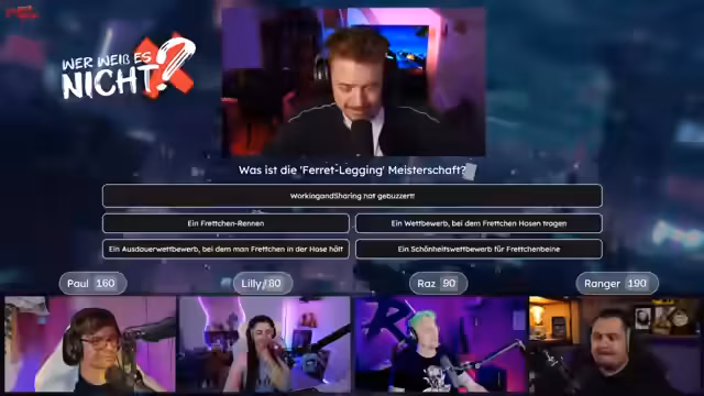 00:54:19Die Quiz-Fragen werden fortgesetzt, darunter die nach dem Lebewesen mit dem größten Auge im Verhältnis zur Körpergröße. Ranger setzt 40 Punkte auf Paul, der fälschlicherweise den "Kobold-Markie" vermutet. Die richtige Antwort ist der "Vampir-Tintenfisch", wodurch Ranger 80 Punkte gewinnt und damit in Führung geht. Der Zwischenstand nach mehreren Fragen ist: Ranger und Paul mit 160 bzw. 130 Punkten, Resertainment mit 120 und Lily the Chili mit 80 Punkten. Die Atmosphäre ist spielerisch und gesprächig.