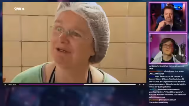 01:57:32Die Doku-Reaction beginnt mit der Vorstellung der Käserei Bornwiesenhof und der Käserin Maike Jaschok. Die Gäste werden mit den Werkzeugen und dem Prozess der Käseherstellung vertraut gemacht, wie dem 'Impfen' der Milch mit Milchsäurebakterien und dem Erhitzen auf eine bestimmte Temperatur. Paul zeigt durchgehend Ekel und Ablehnung gegenüber dem Prozess, während der Streamer und andere Teilnehmer fasziniert sind und Fragen zur Geschichte und Herstellung stellen, was zu humorvollen Kommentaren führt.