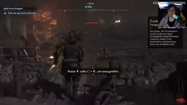 00:57:42Die Figur erhält den Auftrag, Momochi Sando zu finden und zu töten, um die Rebellion von Iga zu beenden. Es folgen Kämpfe und die Feststellung, dass das Spiel interessant ist, aber das Gameplay eher Action-lastig ist. Später wird ein Plan benötigt, um zum ikonischen Ort zu reiten, aber das Pferd wird erschossen. Es folgen weitere Kämpfe und die Aufgabe, ein Kästchen zu beschaffen und zu beschützen, wobei das Leben riskiert wird. Das Kästchen darf weder geöffnet noch geraubt werden. Die Figur muss sich durch Gegner schleichen und kämpfen, um das Kästchen zu finden, wobei sie feststellt, dass es nicht das Kästchen ist, das gestohlen wurde.