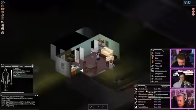 01:05:15Im weiteren Verlauf des Spiels kommt es zu den ersten Verletzungen. Einer der Spieler wird von einem Hund gebissen und ist nun verletzt. Der andere Streamer, der medizinische Fertigkeiten hat, desinfiziert die Wunde und verarztet ihn mit Schmerztabletten und einer Bandage. Der Streamer selbst wird ebenfalls gekratzt und ist nun blutend. Die Anzeichen einer Infektion sind bereits spürbar. Die Spannung steigt, da die Verletzungen unbehandelt zu einem Spielertod führen können.