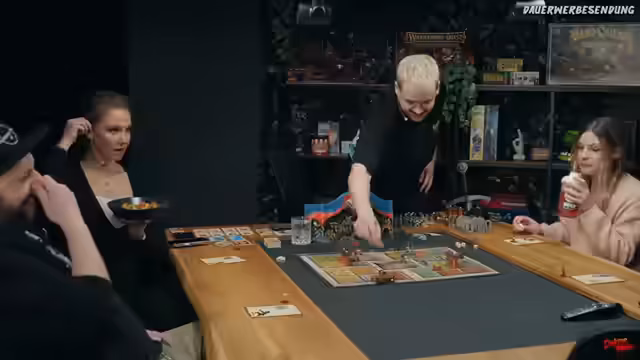 00:49:42Ein Spieler bewegt sich durch die Spielumgebung, landet auf einem Feld mit einem alten Stiefel und stellt witzige Vergleiche mit Dildos an. Es wird über den Wurf von Würfeln, das Aufdecken von Türen und das Vermeiden von Monstern gesprochen. Der Spieler Olli ist an der Reihe und berichtet über die Situation, in der alle goblinartigen Monster bereits besiegt sind. Die anderen Spieler bereiten sich auf ihren Zug vor und interagieren spielerisch.