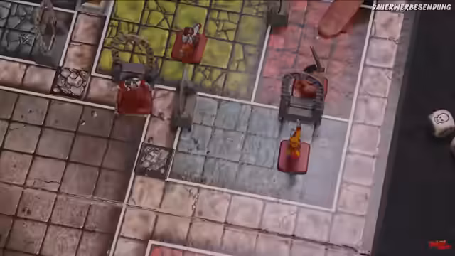 01:42:06Ein Spieler findet eine Geheimtür in einem Raum, der noch nicht untersucht wurde. Nachdem der Flaschengeist-Zauber eingesetzt wurde, um einen Raum zu erkunden, wird der Hexakeller der Goblins aufgedeckt. Um die Moral zu steigern und den Bewegungsbonus zu nutzen, bilden die Helden eine Polonaise, wodurch sie sich als Team besser koordinieren und einen Bonus erhalten.