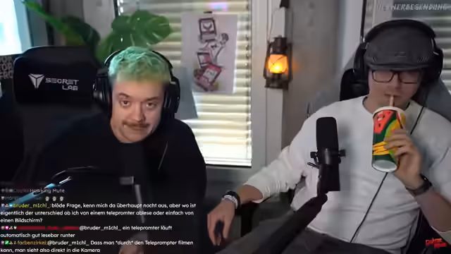 01:38:19Der Streamer entschuldigte sich bei 'Drakon' für den verpassten Raid, da dieser aufgrund der Handy-Verbindung während der Studiotour nicht bemerkt wurde. Es wurde die Frage eines Zuschauers beantwortet, was der Unterschied zwischen dem Ablesen von einem Teleprompter und einem normalen Bildschirm ist. Der Streamer erklärte, dass ein Teleprompter es ermöglicht, den Text direkt in die Kamera zu lesen, da der Bildschirm über einen Spiegel vor der Kameralinse platziert ist. Dadurch entsteht der Eindruck, dass der Sprecher direkten Augenkontakt mit der Kamera hält und frei spricht, anstatt einen Text abzulesen. Bei einem normalen Bildschirm hingegen würde der Blick des Sprechers von der Kamera abweichen, was für die Zuschauer sichtbar wäre.
