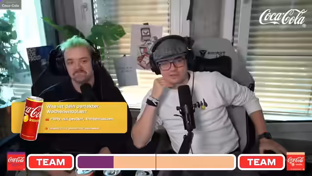 02:05:08Ein interaktives Quiz wird gestartet, um die Charaktereigenschaften der Teilnehmer den verschiedenen Cola-Sorten zuzuordnen. Die erste Frage lautet, wie man in den Tag startet: „Laut Musik, Chaos pur los geht's“ (Cherry) oder „Langsam, ein bisschen da“ (Lemon). Die Mehrheit im Chat und die Streamer selbst tendieren zu Cherry. Die zweite Frage befasst sich mit dem perfekten Wochenendplan: „Party, nix geplant, treiben lassen“ (Cherry) oder „Zu Hause Filme gucken oder was backen“ (Vanilla/Cream). Auch hier wird eine Tendenz zu Cherry festgestellt, wobei die Spontaneität und das „Nichts geplant, treiben lassen“ betont werden, da die besten Partys oft ungeplant entstehen. In diesem Zusammenhang wird auch auf das bevorstehende Charity-Livestreaming-Event „Loot für die Welt“ hingewiesen, das als geplante, aber dennoch beste Party beschrieben wird.