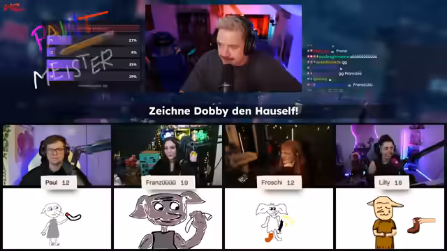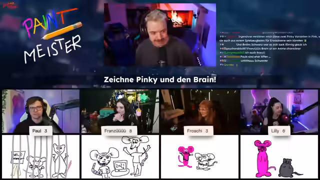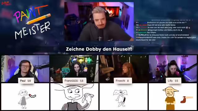 00:51:41Endlich beginnt die neue Folge PaintMeister mit den Gästen Paul, Froschmädchen und Lillythechilly. Der Streamer erläutert kurz das Spielprinzip: Zeichne einen vorgegebenen Begriff in rund drei Minuten. Die große Neuerung ist, dass nun alle Chats der Teilnehmer sowie der Live-Chat mit Ausrufezeichen 1-4 für die Abstimmung genutzt werden können. Die erste Aufgabe lautet: Zeichne Thaddeus Tentakel.