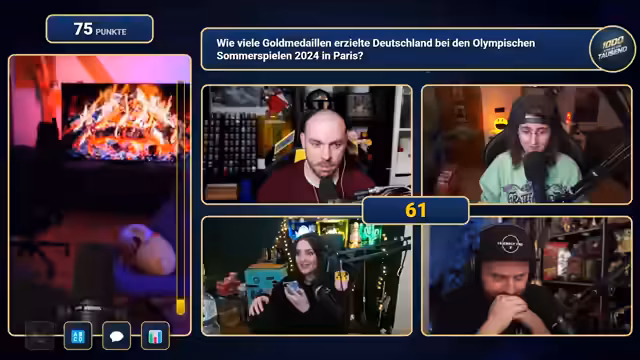 00:55:43Nach einem Intro und einer erneuten Zusammenfassung der Regeln beginnt das Quiz mit der ersten Frage zur Kategorie 'Sport', die sich auf einen Doping-Skandal bei der Fußball-WM 1994 bezieht. Die Gäste antworteten mit 'Maradona' und erhielten dafür 61 Punkte. Die zweite Frage bezog sich auf die Anzahl der deutschen Goldmedaillen bei den Olympischen Spielen 2024 in Paris. Da die Teilnehmer die Antwort nicht kannten, setzten sie den Telefonjoker ein und rufen Jay an, der mit der Antwort 'zwölf' für 136 Punkte sorgte.