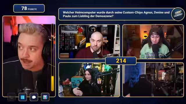 01:10:10Zu Beginn der Runde wird eine Sportfrage zur olympischen Seilsportart gestellt. Nach Diskussionen über Seilspringen und Balancieren wird die falsche Antwort 'balancieren' gegeben, während die korrekte Antwort 'Tauziehen' war. Danach folgt eine Frage zur Demoszene. Der Chat antwortet mit 'Amiga', was als richtig bestätigt wird. Streamer erklären den technischen Vorsprung des Commodore Amiga durch seine Custom Chips und erinnern sich an illegale Kopierprogramme wie X-Copy und das Brennen von CDs im Schulhof.