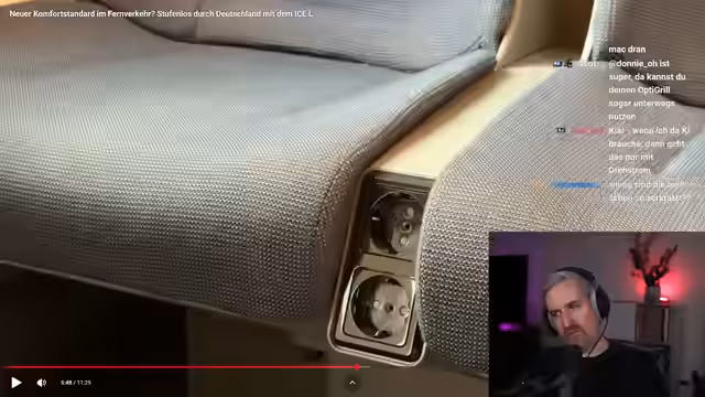 01:37:29Der Streamer ist verwirrt über die Klassifizierung des ICE L als ICE, da er das Design eher einem Intercity zuordnet. Er kritisiert die Anordnung der Steckdosen im ICE L, die seiner Meinung nach altmodisch und unpraktisch sind, da sie oft Probleme verursachen und nicht den modernen Bedürfnissen entsprechen, wie fehlende USB-C-Anschlüsse. Er wünscht sich eine quer angeordnete Steckdose und zusätzliche USB-Anschlüsse. Die Diskussion über Barrierefreiheit entfacht eine kurze Kontroverse im Chat, da der Streamer zunächst einen Witz über die 76 cm hohe Stufe macht, ohne an die Bedeutung der Barrierefreiheit für Rollstuhlfahrer zu denken. Er korrigiert sich jedoch schnell und betont, dass jeder Zug barrierefrei sein muss. Er ist weiterhin irritiert über das Design des Zuges, insbesondere über die „Wulste“ oben. Ein Chat-Kommentar, der das 'L' im ICE L auf ihn bezieht, findet er clever. Er kritisiert zudem, dass es keine Leseleuchten oder Fußstützen gibt, die in anderen Fernverkehrszügen Standard sind. Das Design des Familienbereichs wird als nicht zeitgemäß empfunden, und er schlägt humorvoll vor, stattdessen Regenbogen, Vögel oder Schweinchen zu integrieren. Er betont die Wichtigkeit moderner, höhenverstellbarer Tische an Rollstuhlstellplätzen als „future shit“.