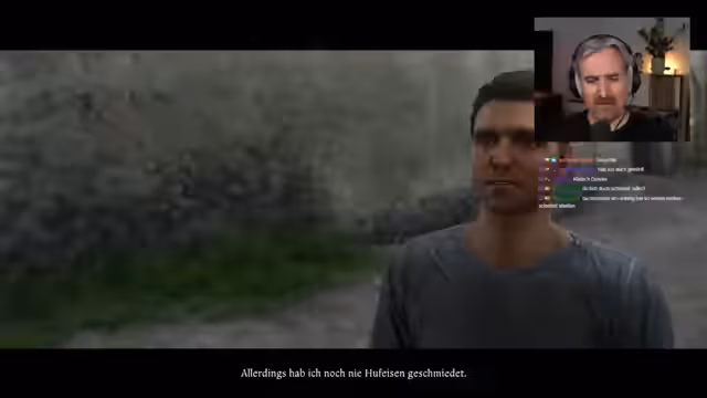 00:26:28Eine der ersten Aufgaben, die der Streamer annimmt, stammt vom Schmied Osina. Er soll ein Hufeisen für den Stallknecht schmieden. Dieser Prozess erweist sich als äußerst umständlich und frustrierend, da der Streamer die Handwerksmechanismen des Spiels kaum beherrscht. Nebenbei kommt es zu Konfrontationen mit NPCs, wie einem überheblichen Schmied, dem er mit Drohungen gegenübertritt, und dem Versuch, Thomas im Jungfrauenturm zu finden, wobei er auf Wachen stößt und in Missstände gerät.