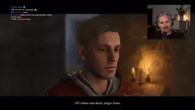 01:52:59Der Streamer erreicht Thomas gerade noch rechtzeitig und übergibt ihm das Elixier. Anschließend wird er zum Burgherrn Otto von Bergen beordert, einem mächtigen Baron. Während des Gesprächs wird ein großer Plot-Twist offenbart: Die Mission ist eingebettet in einen Konflikt zwischen zwei Königsparteien, Team Wenzel und Team Sigismund. Die Charaktere sind Boten von Caprons Vater und versuchen, Verbündete für ihre Seite zu gewinnen, was die Lore des Games erheblich vertieft.