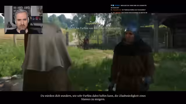 00:10:53Zur Vorbereitung der Hochzeit in Semin schlägt Crazel einen kreativen Plan vor: Er möchte eine Zuberdirne als angebliche adelige Dame für den Kämmerer Ulrich von Troski einschleusen. Um sie überzeugend erscheinen zu lassen, benötigt sie ein edles Kleid und Parfüm. Der Streamer muss also eine passende Frau aus dem Badehaus von Sellejo finden, bekleiden und parfümieren, um so Zugang zur Burg zu erhalten und nach einem Buch zu suchen.