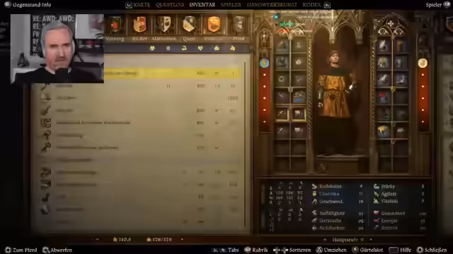 02:32:29Der Streamer erreicht den Weinhändler und kauft eine Flasche edlen Wein. Kurz darauf stellt er fest, dass sein Pferd überladen ist, was ihm das Aufsitzen verhindert. Er muss daher einige Gegenstände in seine Tasche verlagern. Nachdem er alle Aufgaben erledigt hat, macht er sich auf den Weg zurück ins Nomadenlager, um Annalyn die erworbenen Gegenstände zu übergeben. Er speichert den Spielstand und beendet den Stream mit einem kleinen Essensblick, bei dem er Brot in den Ofen schiebt.