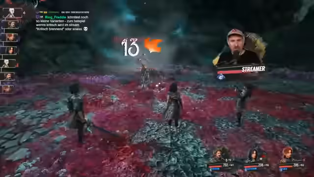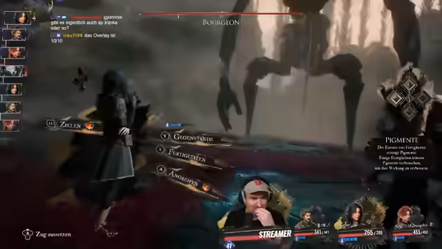 01:02:25Im Stream konzentriert sich der Streamer auf einen anspruchsvollen Bosskampf, bei dem er mit strategischen Entscheidungen und Ressourcenmanagement ringt. Er stößt auf Probleme mit den Aktionspunkten (AP), was seine Angriffsoptionen einschränkt, und muss improvisieren. Stream-Zuschauer geben Ratschläge, während er sich durch die Kämpfe kämpft, zögert und manchmal frustriert über eigene Fehler wie Fehlparaden oder zu spätes Ausweichen ist. Trotz der Hürden bleibt er optimistisch, den Boss besiegen zu können und lernt aus den taktischen Fehlern der vorherigen Runden.