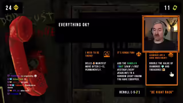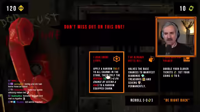 03:18:56Der Streamer erreicht seine bisher höchste Runde und versteht nun besser, dass es vorteilhaft sein kann, mehr Geld zu investieren, um dem 666-Debuff zu entgehen. Er erwägt den Kauf eines Schlüssels an der Wand und fragt sich, ob dies der Schlüssel zum Sieg ist. Nach dem letzten Spin und dem Erhalt von 3.000 Coins gibt er das Nötigste ab und fragt sich, ob das Spiel damit beendet ist. Er entdeckt einen passiven Buff, der seine Patterns verbessert und nimmt diesen an. Er wirft einen Blick auf seine Mails und freigespielte Legendaries, die er sich später genauer ansehen möchte. Er analysiert seine Charms und überlegt, welche er loswerden kann. Dabei entdeckt er, dass sich Free-Restock-Dinger stacken. Er checkt den Schlüssel und stellt fest, dass er sich damit quasi für immer geupgradet hat. Er entdeckt die Ablagefunktion und überlegt, wie er diese am besten nutzen kann. Er vergleicht diese Option mit Balatro und findet sie dort zu OP. Er beginnt, die Designs der Charms zu erkennen und analysiert den Greedy King Charm. Er nimmt einen Property Certificate, um Platz für mehr Lucky Charms zu schaffen und trickst das Spiel aus, indem er einen Charm in die Draw legt und direkt wieder zurücknimmt.