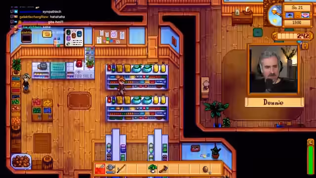 00:29:56Während seiner Erkundungen im Dorf trifft der Streamer auf eine streunende Katze, die er adoptiert und den Namen Uwe gibt. Sein nächstes Ziel ist es, Blumenkohl für die Dorfbewohnerin Jodi zu besorgen. Beim Betreten des Dorfladens von Pierre wird er Zeuge eines Konflikts, in dem der Konkurrent Morris den Laden mit Preissenkungen attackiert, um die kleinen Geschäfte zu untergraben.