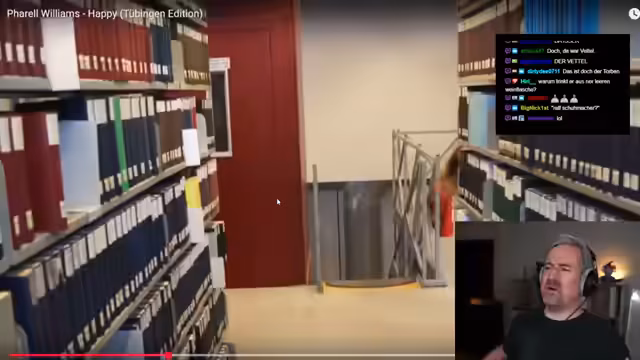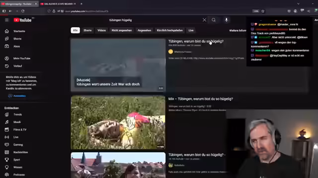 00:15:20Nachdem der Streamer die Geschichte mit dem Wasserschaden beendet hat, springt er zu einem Thema, das ihm viele Zuschauer zugeschickt haben: ein Video von der Frage "Tübingen, warum bist du hügelig?", das viral gegangen ist. Er erzählt aus seiner Kindheit und Jugend in Tübingen, z.B. das Spielen von "Lupferle" oder "Arschbolzen" auf dem Marktplatz. Er beginnt dann, das Video von 2014 zu rezipieren, wobei er sich besonders über die synchronen Tanzbewegungen und die offensichtlich genervten Teilnehmer amüsiert.