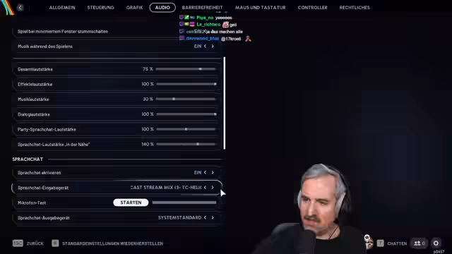 00:10:21Zu Beginn des Streams treten technische Probleme auf, wie Frame-Drops und CPU-Last. Der Streamer experimentiert live mit den Grafikeinstellungen, wie dem Ausschalten der vertikalen Synchronisation und der Anpassung von Raytracing, um die Performance zu verbessern. Er interagiert stark mit dem Chat, fragt nach Rat und nimmt Hilfestellungen an. Dabei stellt er fest, dass die Sprachchat-Funktion zur Kommunikation mit anderen Spielern im Spiel funktioniert, was er als 'Allergeilste' bezeichnet.
