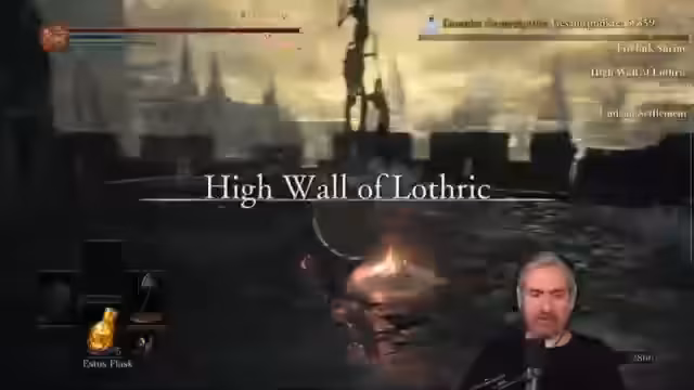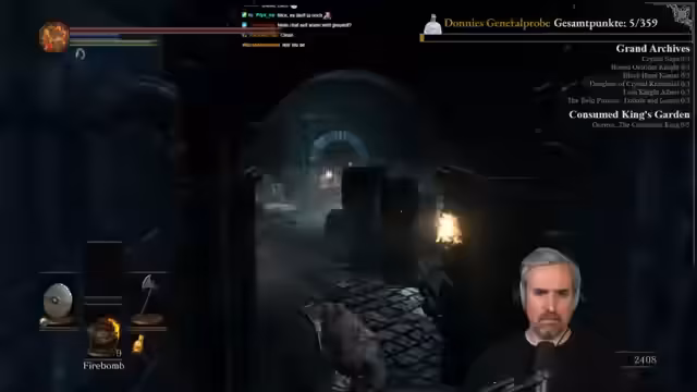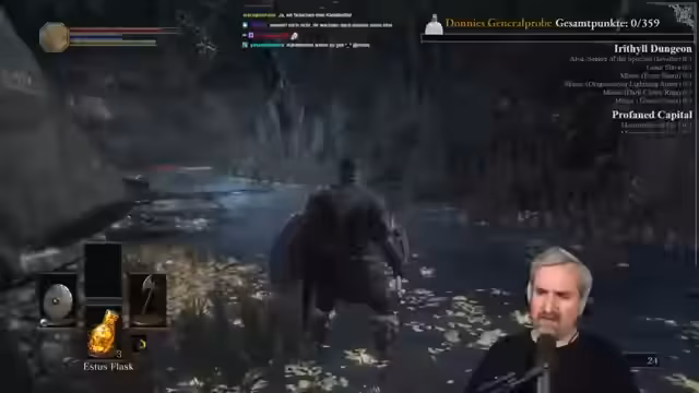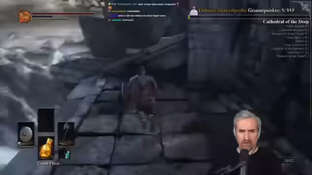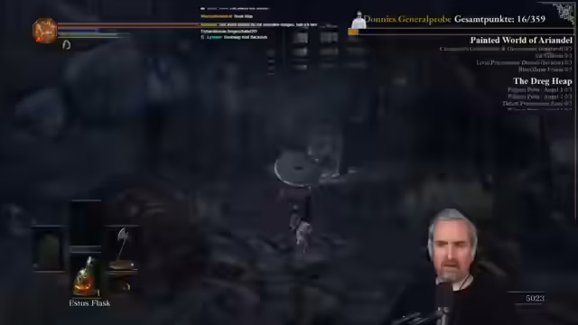 00:55:28Das Gameplay beginnt mit dem Kampf gegen die ersten Gegner und der Auseinandersetzung mit dem ersten Boss, Ludex Gundyr. Obwohl die Axt als starke Waffe angesehen wird, fühlt sich der Streamer unbeholfen und schießt sich selbst mit der mangelnden Treffsicherheit der Waffe an. Parallel dazu kämpft er mit technischen und akustischen Problemen. Das Overlay gibt keinen 'Geiler Kill'-Sound aus, selbst nach Anpassungen, was ihn zusätzlich stresst. Statt sich auf den Konflikt mit dem Boss zu konzentrieren, wird er durch diese technischen Unstimmigkeiten und die daraus resultierende Frustration abgelenkt.