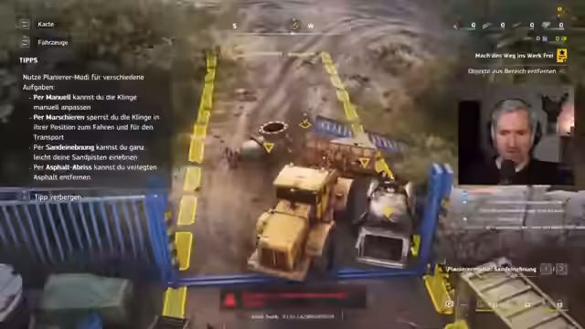 01:59:07Das Stream-Team beginnt mit grundlegenden Spielmechaniken. Die Spieler interagieren mit einem Fahrzeug und versuchen, Objekte zu bewegen und zu platzieren. Es kommt zu Diskussionen über die korrekte Bedienung, wie zum Beispiel das Ziehen von Lasten. Die Stimmung ist humorvoll und von gegenseitigem Aufspießen geprägt, wobei die Spieler nach einer anfänglichen Verwirrung eine funktionierende Methode zum Transportieren von Betonfliesen finden.