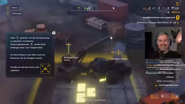 02:01:16Die Spieler wechseln zu einem Faltkran, um eine anspruchsvollere Aufgabe zu bewältigen: das Einlagern von Betonfliesen mithilfe des Krans. Dies erfordert eine präzise Steuerung, die Kransteuerung muss aktiviert und die Last muss richtig angekoppelt werden. Die Prozedur ist komplex und führt zu technischen Schwierigkeiten, da der Kran sich teilweise festfährt, was zu frustrierenden aber auch lustigen Aktionen führt.