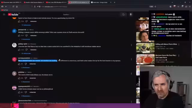 01:09:15Der Streamer präsentiert ein Reaktionsvideo, bei dem er ein Kochvideo des englischen Kochs Marco Pierre White beobachtet. Er zeigt sich beeindruckt von der intensiven und detailorientierten Vorgehensweise des Kochs, insbesondere der Methode, Zwiebeln und Knoblauch zu raspeln, um Wasser zu entziehen. Das Video ist inhaltlich eine Tomatensauce, die aber über eine Stunde im Ofen gegart wird, was den Erwartungen des Thumbnails „perfekte Sauce in 5 Minuten“ widerspricht. Die Zuschauer kommentieren dies humorvoll als Safe-Clickbait.