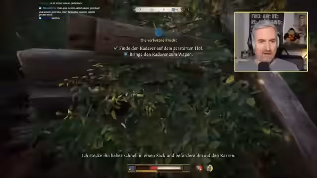 01:27:15Nachdem der Streamer die frustrierende Quest vorläufig abgebrochen hat, findet er zu einer lockeren Spielweise zurück. Er klaut ein Hühnchen, trinkt Honig und unternimmt einen kurzen Plausch mit dem Chat. Danach startet er neu und fokussiert sich auf die ursprüngliche Quest zum Totengräber Ignatius. Durch den klaren Fokus und die konkreten Aufgaben fühlt er sich wieder motiviert und weniger überfordert.
