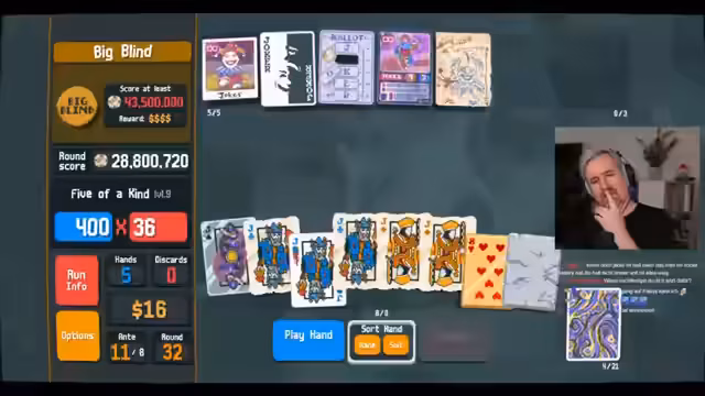 01:58:39Nach langem Kampf und strategischem Feinschliff gelingt es dem Streamer, ein massives Punktesystem auszulösen. Durch gezieltes Kombinieren der Karten, insbesondere des Red Seals, knackt er die 2,5-Millionen-Marke. Dieser Moment wird als größter persönlicher Erfolg im Ballatro gefeiert und schließlich kommt das lang erwartete 100%-Achievement für die Gold-Stakes-Decks.