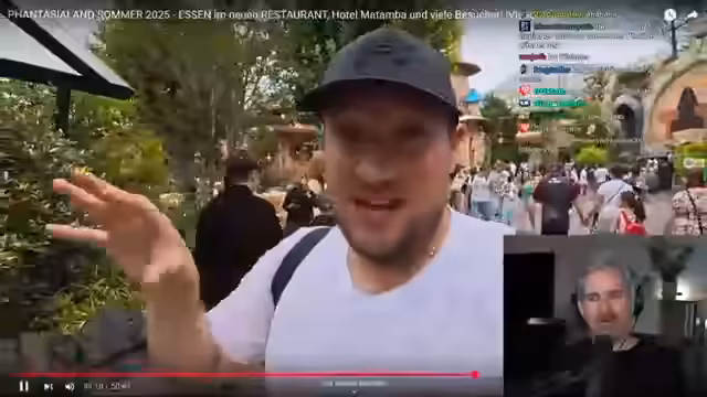 01:25:33Der Streamer reagiert auf den Anfang des Videos, in dem Parkfan und seine Freundin früh im Phantasialand ankommen. Er äußert seine Bewunderung für die älteste noch betriebene Attraktion, die Geisterriksha, und findet deren Aussehen charmant und ein bisschen in die Jahre gekommen. Er freut sich über den perfekten Start des Tages, da sie mit der Black Mamba fahren und der Park kaum ausgelastet ist. Er erwähnt, dass er abgenommen hat und sich in der Achterbahn wohler fühlt.